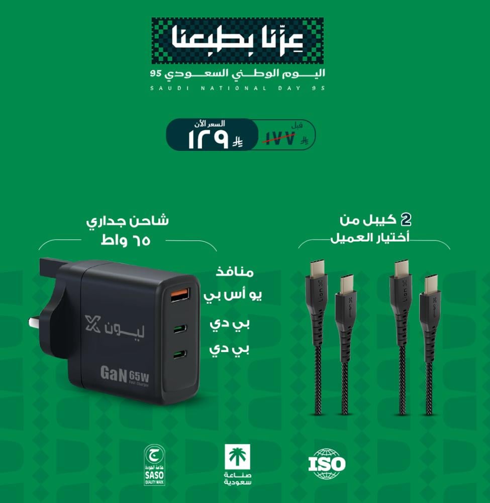 عرض اليوم الوطني - شاحن جداري 65 واط بي دي من أختيارك مع 2 كيبل ليون اكس 1 متر من أختيارك